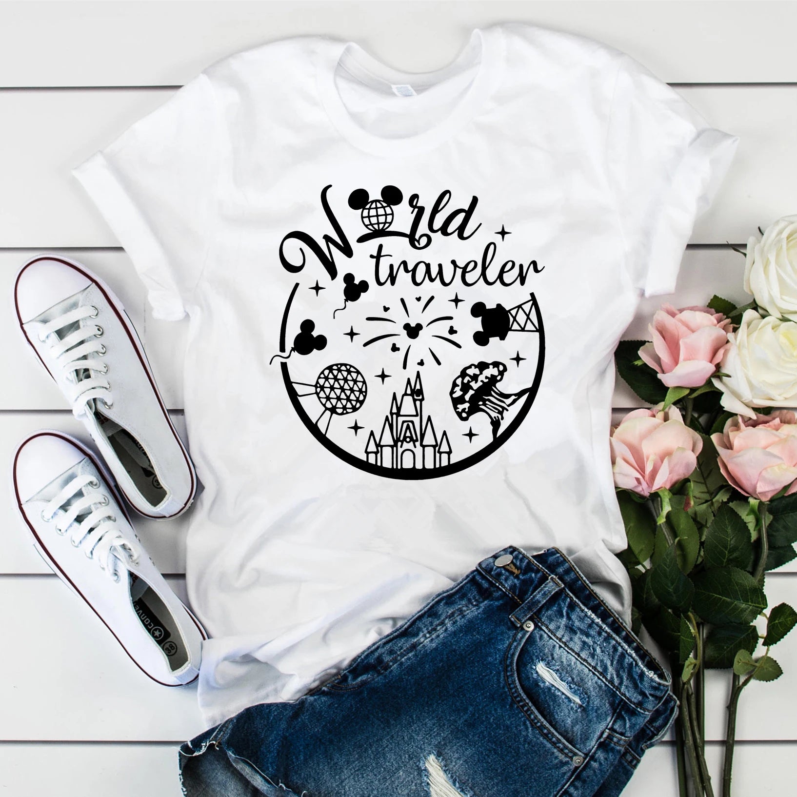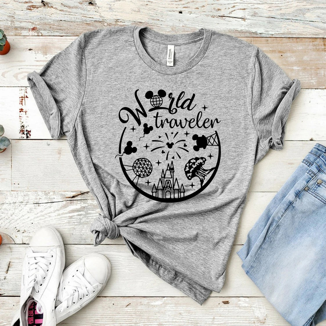 Experience the magic of Disney World with our World Traveler inspired tee! Show off your love for Disney on your next vacation. Capture memories and create unforgettable moments with this comfortable and stylish tee. A must-have for every Disney enthusiast!