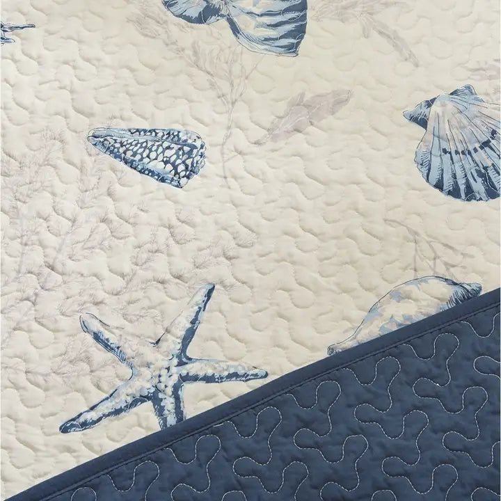 Create a coastal getaway right in your guest room. Made from polyester microfiber the quilted daybed and shams feature assorted seashells accentuated with light and dark blue coloring on an ivory background. In a deep taupe color, a coral motif is printed on the background to give another dimension to this pattern. The reverse of both the daybed and sham are the same corresponding dark blue from the face giving you a reversible option with your shams.