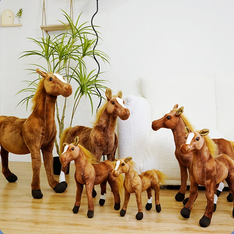 The smallest size measures approximately 11 inches in height by 11 inches in length, perfect size for small hands to hold and cuddle. The horse has realistic features, with a mane and tail the children will love to brush and play with.