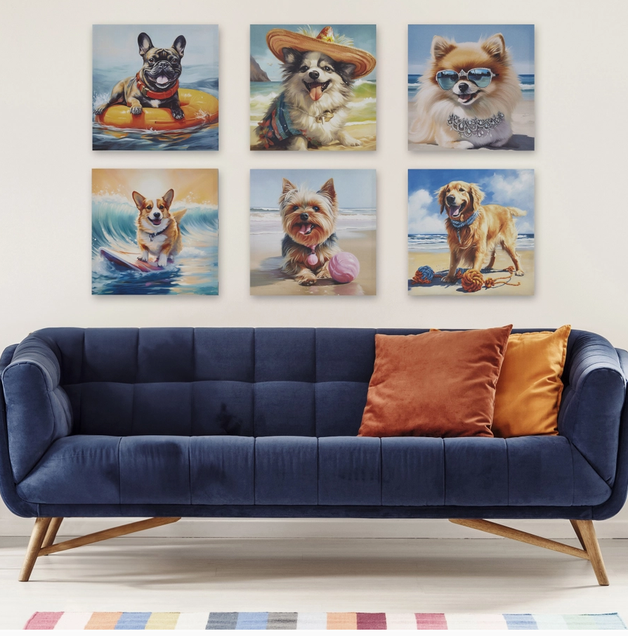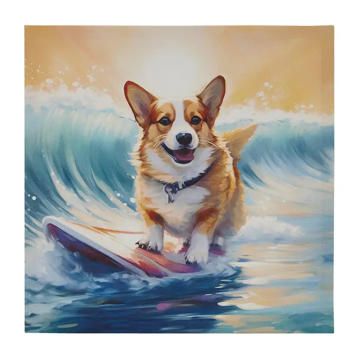 Elevate your space with our Corgi Surfing Waves Wall Art. This delightful canvas print features a happy corgi dog in the ocean, bringing joy and adventure to any room. Hang one or multiple of other Beach Dog canvas for your living room, dining room decor. Ready to hang with a pre-installed Sawtooth hanger, it's easy to display. Measuring 16"W x 16"H x 1"D, this indoor decor by artist Tessa Kane adds personality and charm.