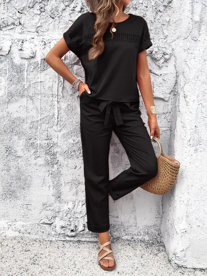 Casual Rolled-Sleeve T-Shirt Lace-Up Trousers Set