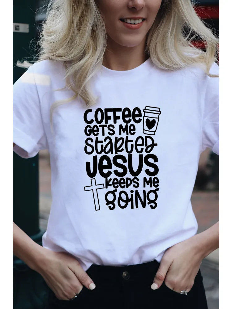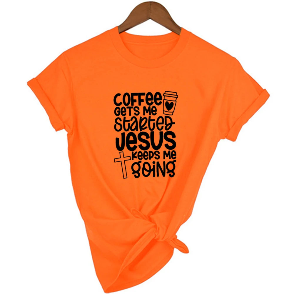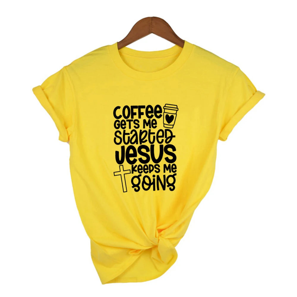 Start your day with a boost and stay inspired with this Coffee Gets Me Started Jesus Keeps Me Going T-Shirt. With its catchy phrase and comfortable fit, it's a perfect way to show your love for both coffee and your faith. Stay energized and motivated with this must-have tee!