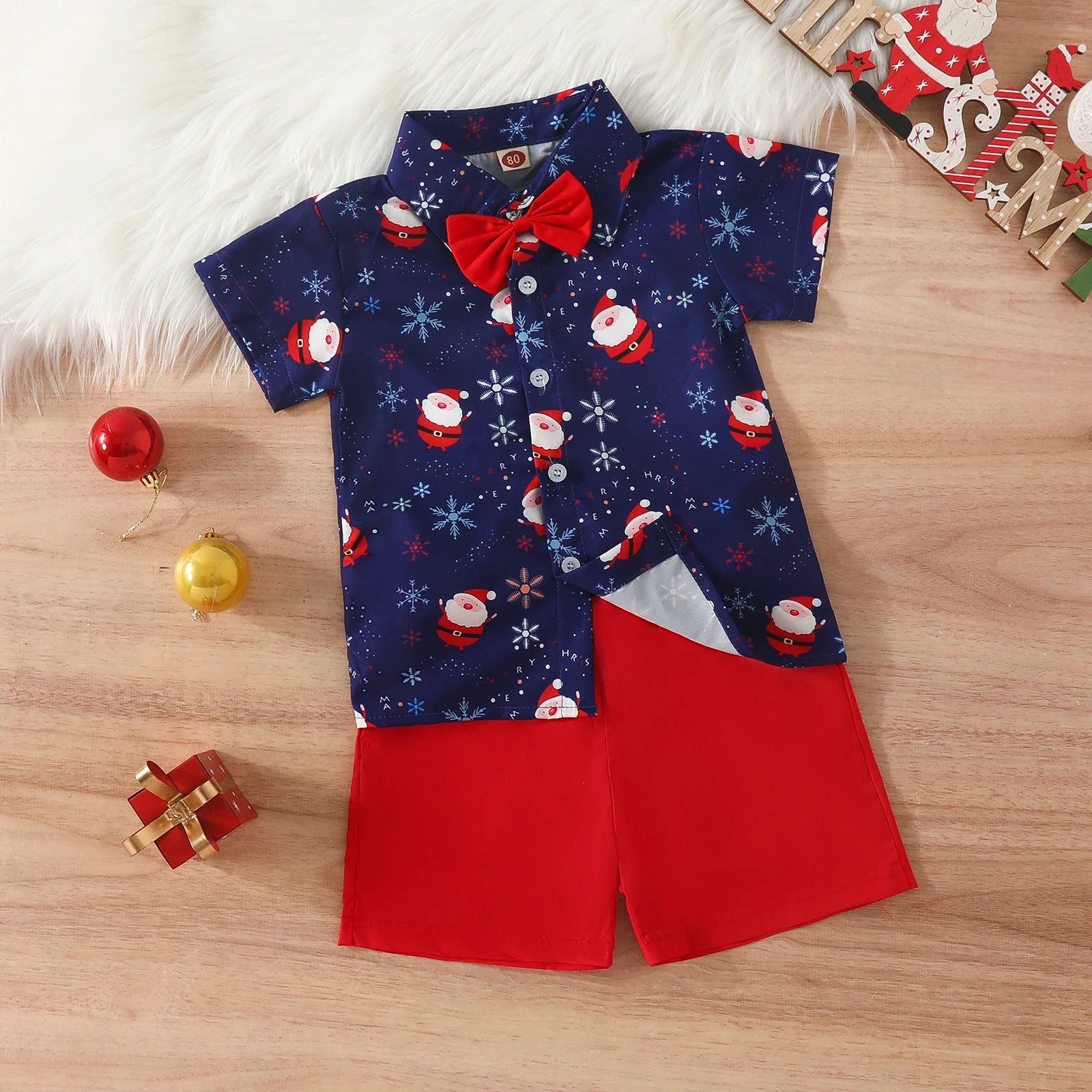 Brighten up your little one's holiday season with our Toddler Boys Bowtie Santa Christmas Outfit. This adorable outfit features a festive bowtie and cute Santa design, perfect for holiday parties and photos. Your child will look and feel festive in this charming and comfortable outfit.