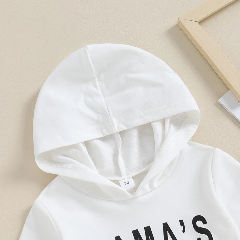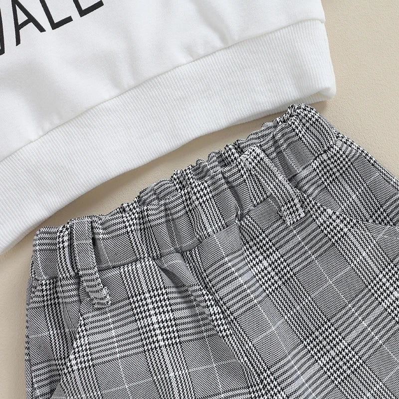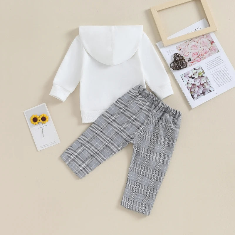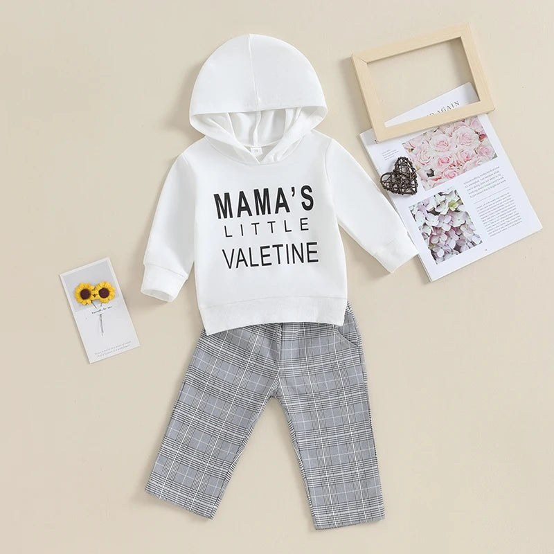 This Valentine's Day, dress your little boy in Mama's Little Valentine - a 2 piece outfit featuring gray plaid pants and a cozy white hoodie. Perfect for infants and toddlers, this outfit is both stylish and comfortable for your little one to wear. Show off your love with this adorable ensemble.