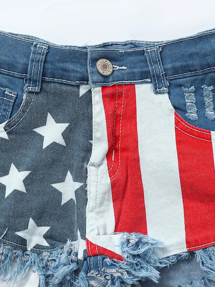 Girls Stars Stripe Patriotic Denim Shorts. These patriotic denim shorts offer the best of both worlds - comfort and style. With their classic stars and stripes design, your little girl will stand out in any crowd. You can have them just in time for your next family event or celebration.