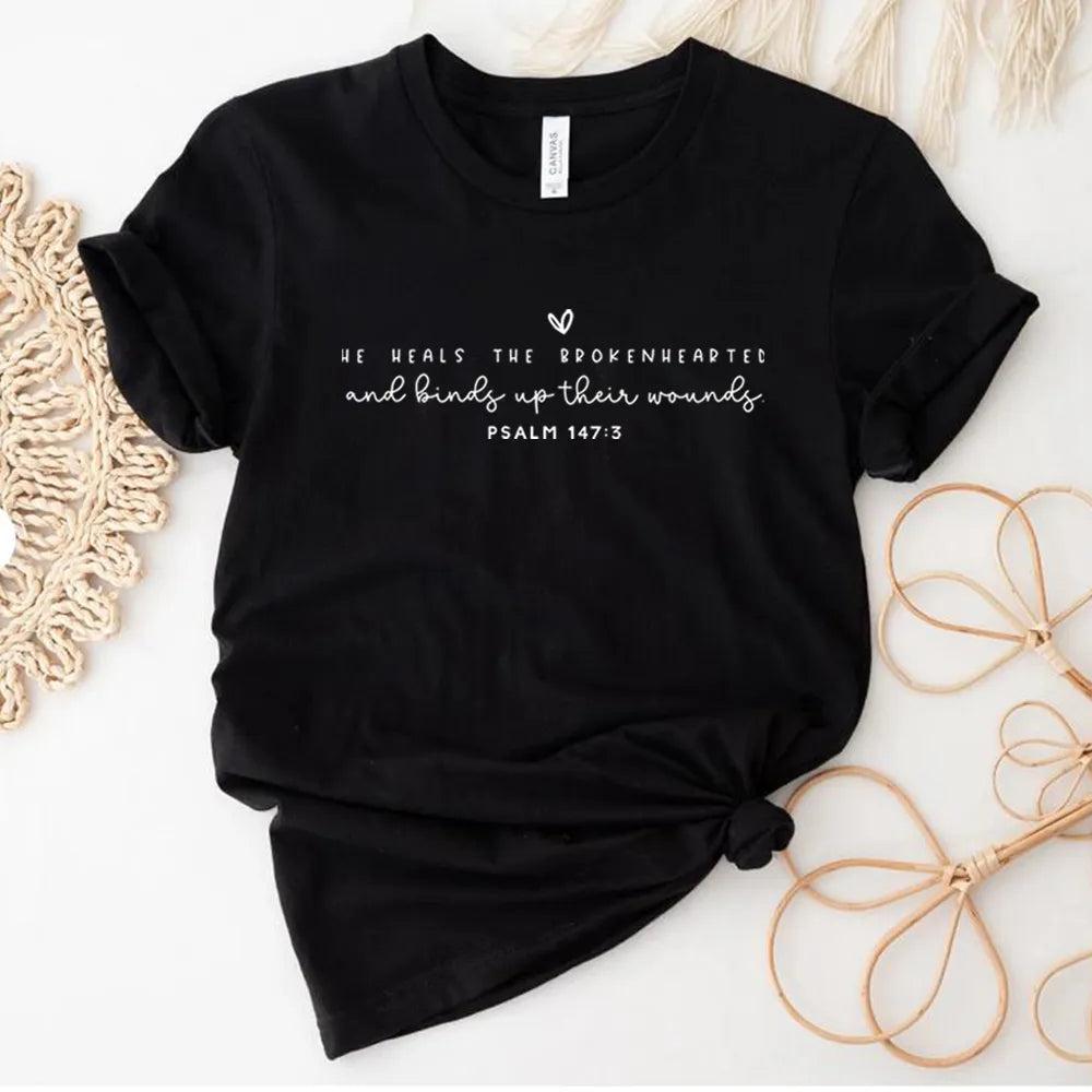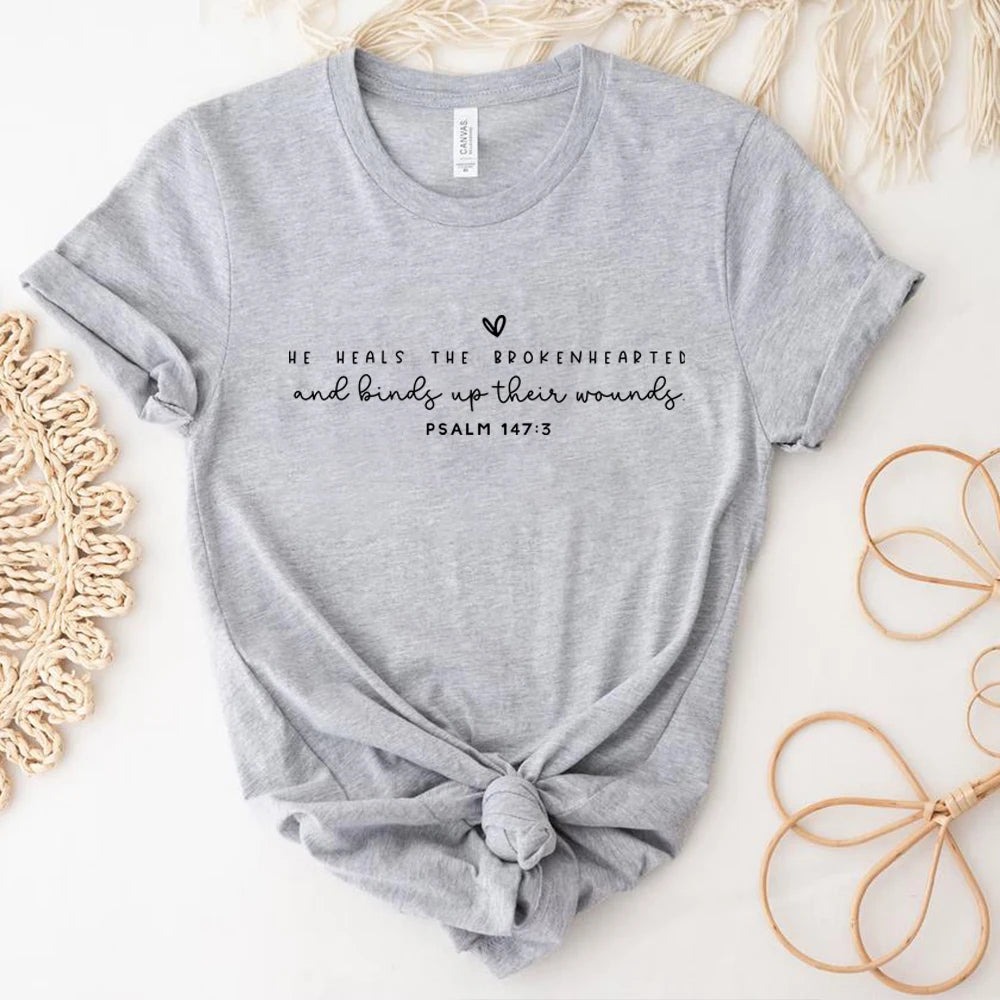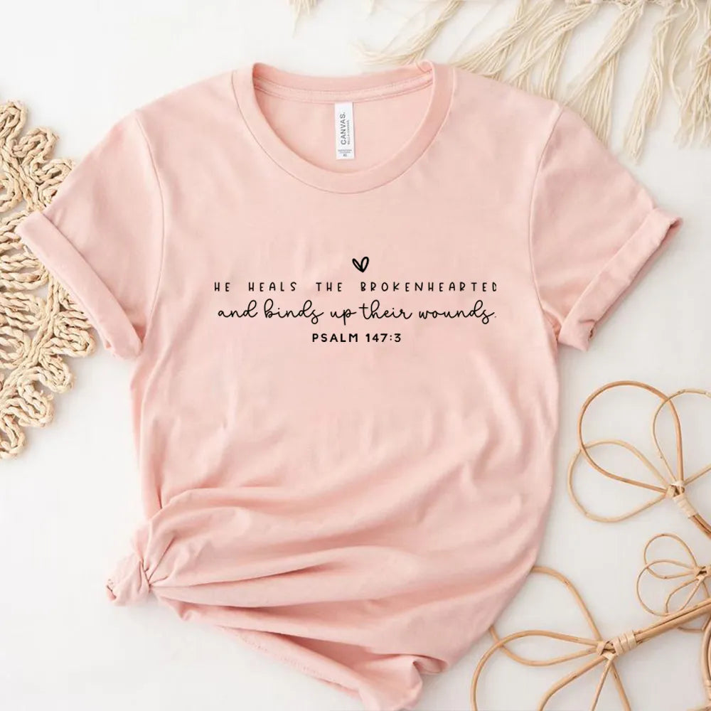 Experience inner peace and comfort with our "He Heals The Brokenhearted" women's t-shirt. Made with soft fabric to keep you comfortable all day long, this Christian faith tee features the powerful message of Psalm 147:3. Embrace its inspiring words and share your faith with the world.