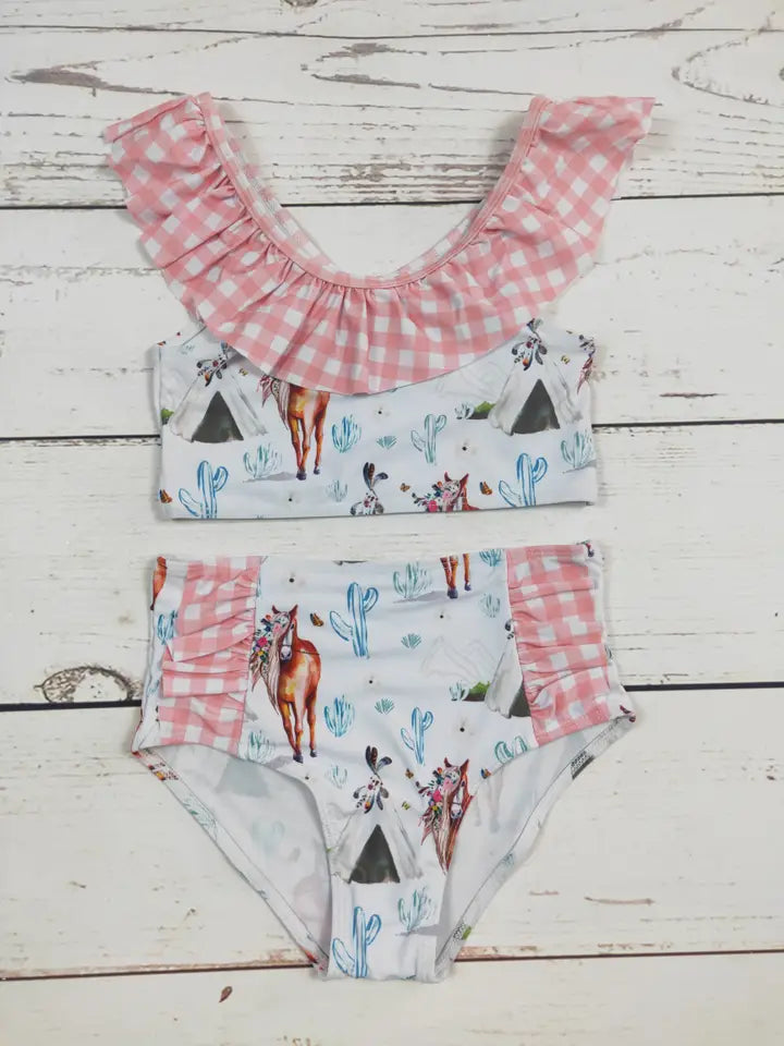 Horse Cactus Printed Two Piece Girls Summer Swim. Whether your little one loves the outdoors or just wants to make a splash at the pool, this Horse Cactus Printed Two Piece Girls Summer Swim Set has got them covered! You'll have plenty of time to plan your next beach day or pool party!