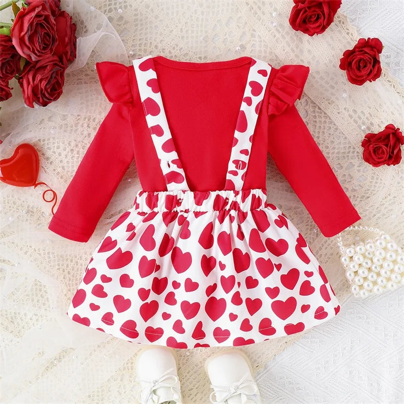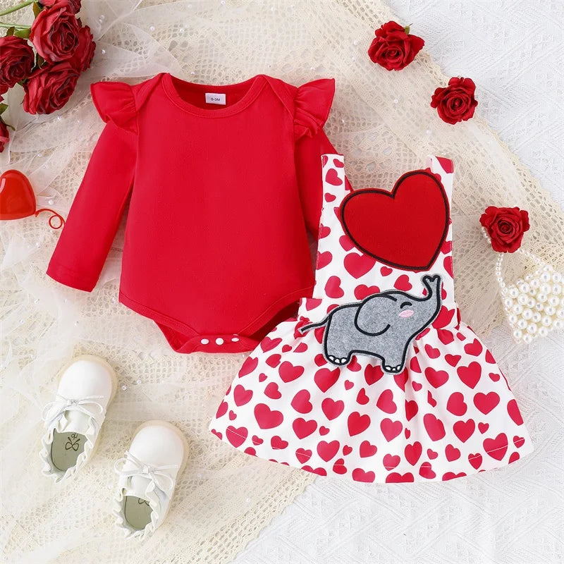 Celebrate love with our adorable Infant Baby Girl Valentines Day Outfit! This 2-piece set includes a ruffle long sleeve romper with a 3D heart design and a suspender skirt with a cute elephant print. Perfect for your little one to spread love and cheer on Valentine's Day.