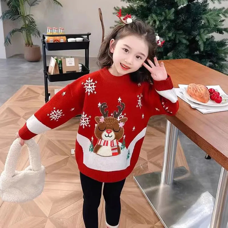 Make your little girl's Christmas even more festive with our Girls Christmas Reindeer Pullover Sweater! This adorable sweater features a cute reindeer design, perfect for holiday gatherings or cozy nights by the fire. Keep your child warm and stylish this holiday season with our cozy sweater.