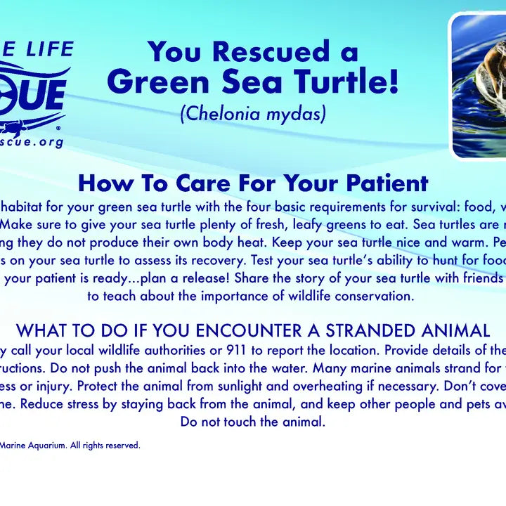 Now kids can create their own story of rescue, rehab, and release with their own plush patient! Symbolically rescue a green sea turtle; knowing the funds are going directly to the real teams working on real rescues, rehabilitation, and species protections.