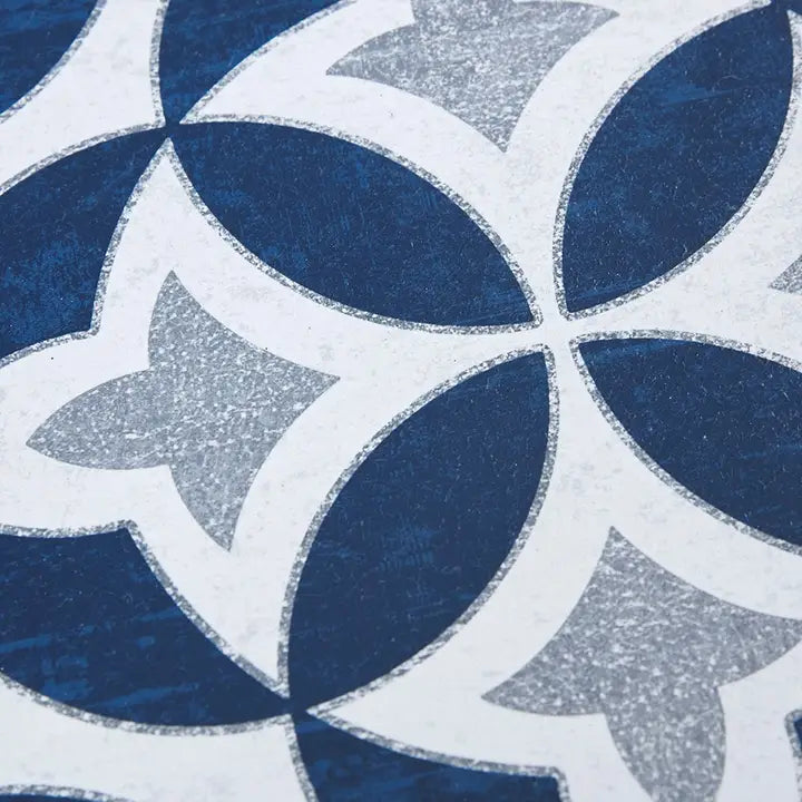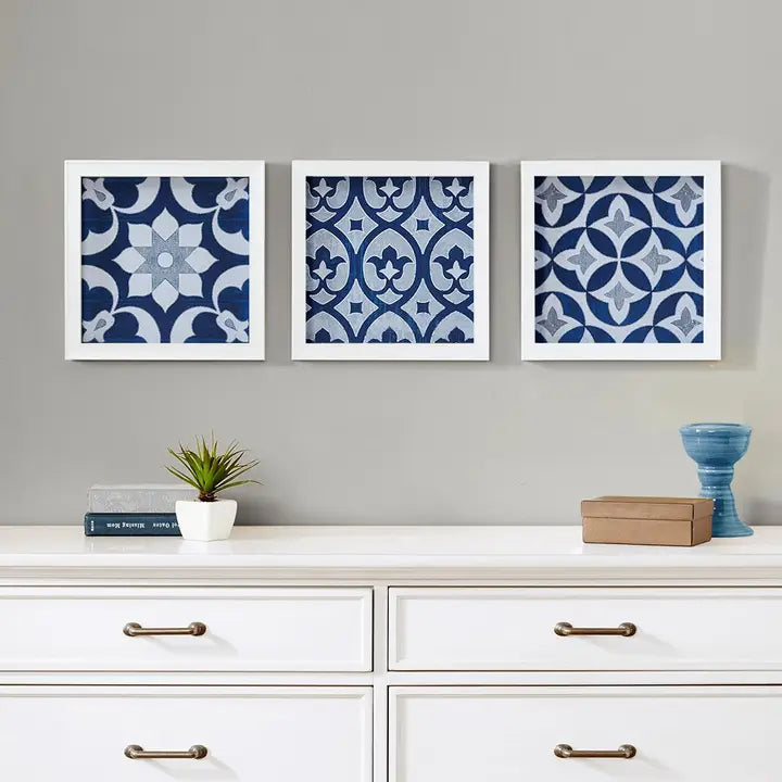This three piece set features a global inspired pattern in dynamic shades of deep blue, crisp white, and cool greys creating beautiful Grecian like tiles. Each piece of art is printed on paper and gel coated for texture and a light gloss look, then finished off with a white frame for a shadowbox effect. Sawtooth finish is featured on reverse of each piece for easy hanging; easily assemble the pieces together horizontally or vertically to fit any space or hang pieces separately for a more stylized approach. Spot clean only and measuring 13.75x13.75", this set is perfect to add subtle color to any entry way, kitchen space, or bathroom.