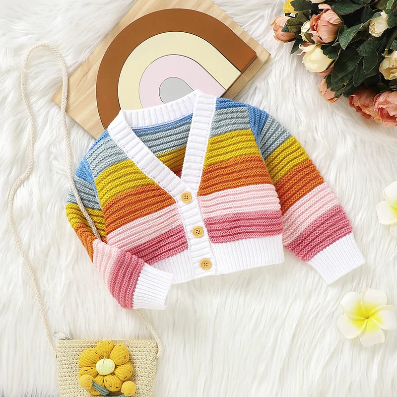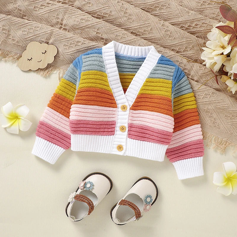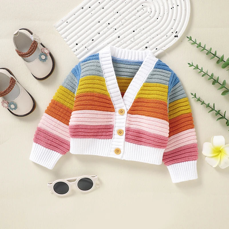 Wrap your little one in a burst of color with our Cardigan Rainbow Sweater! This vibrant and playful cardigan features a rainbow design that will brighten up any outfit. Crafted with soft materials, it's perfect for keeping your baby or toddler cozy and stylish. Get ready to spread some rainbow cheer.