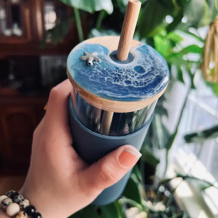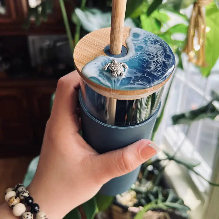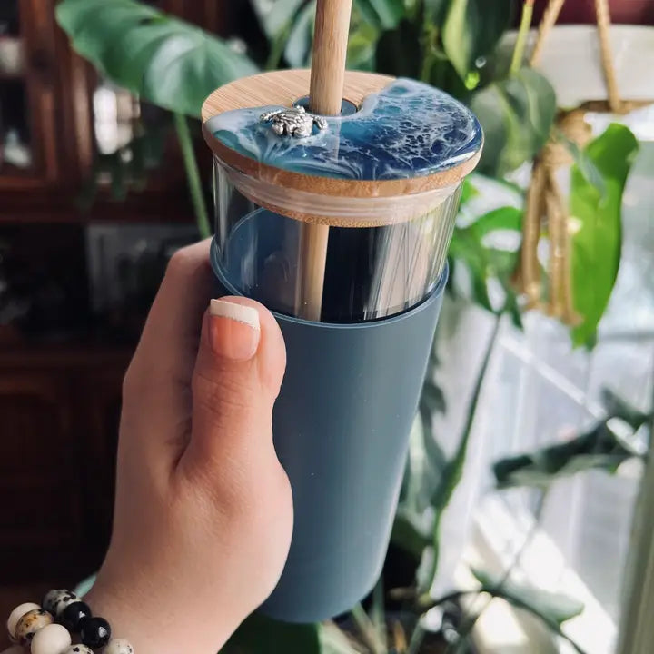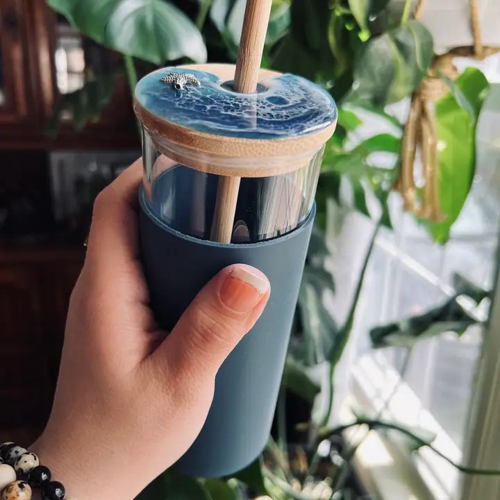 Ocean Bamboo Coffee & Drink Glass Tumbler w/ Silicone Sleeve