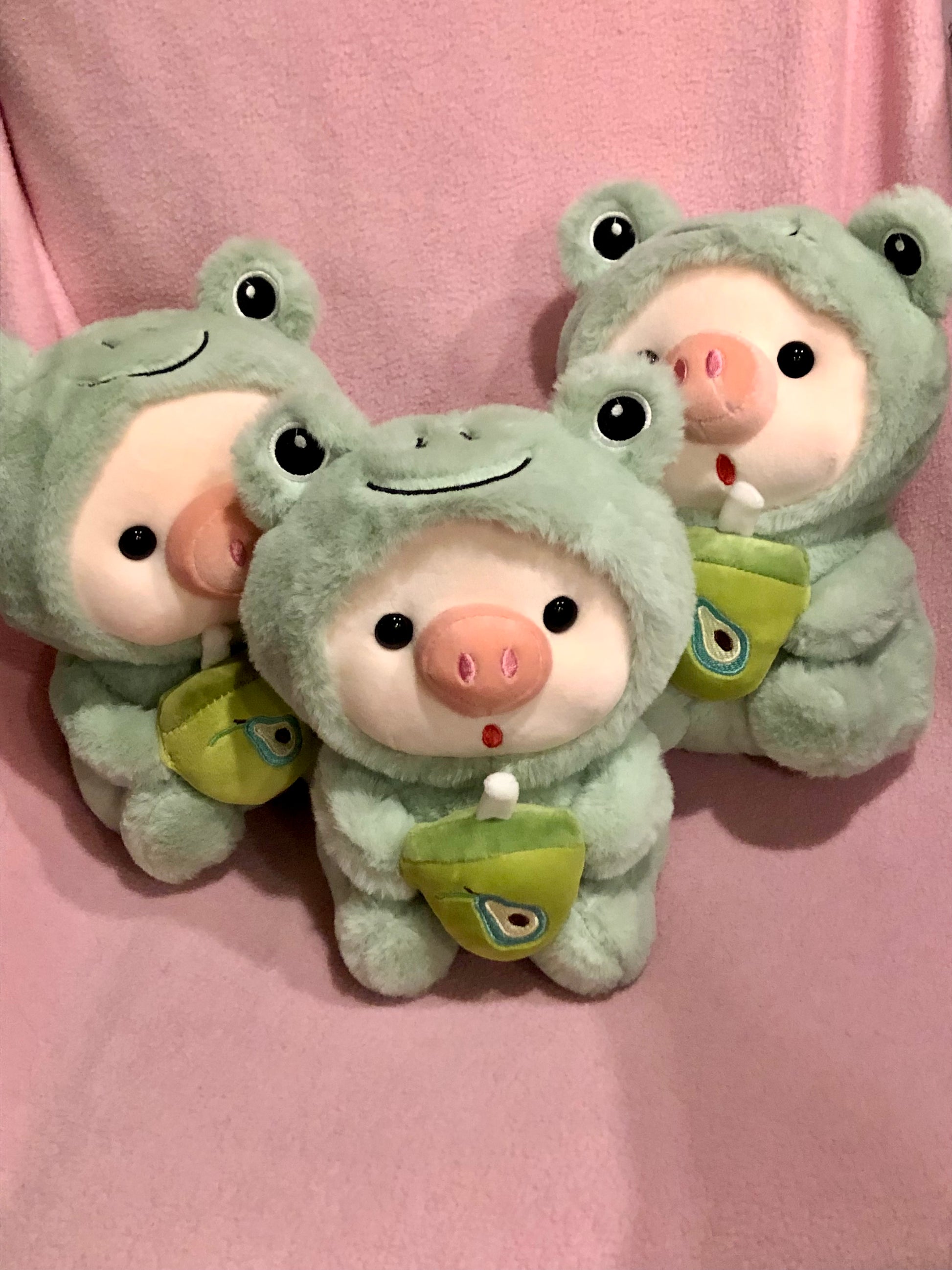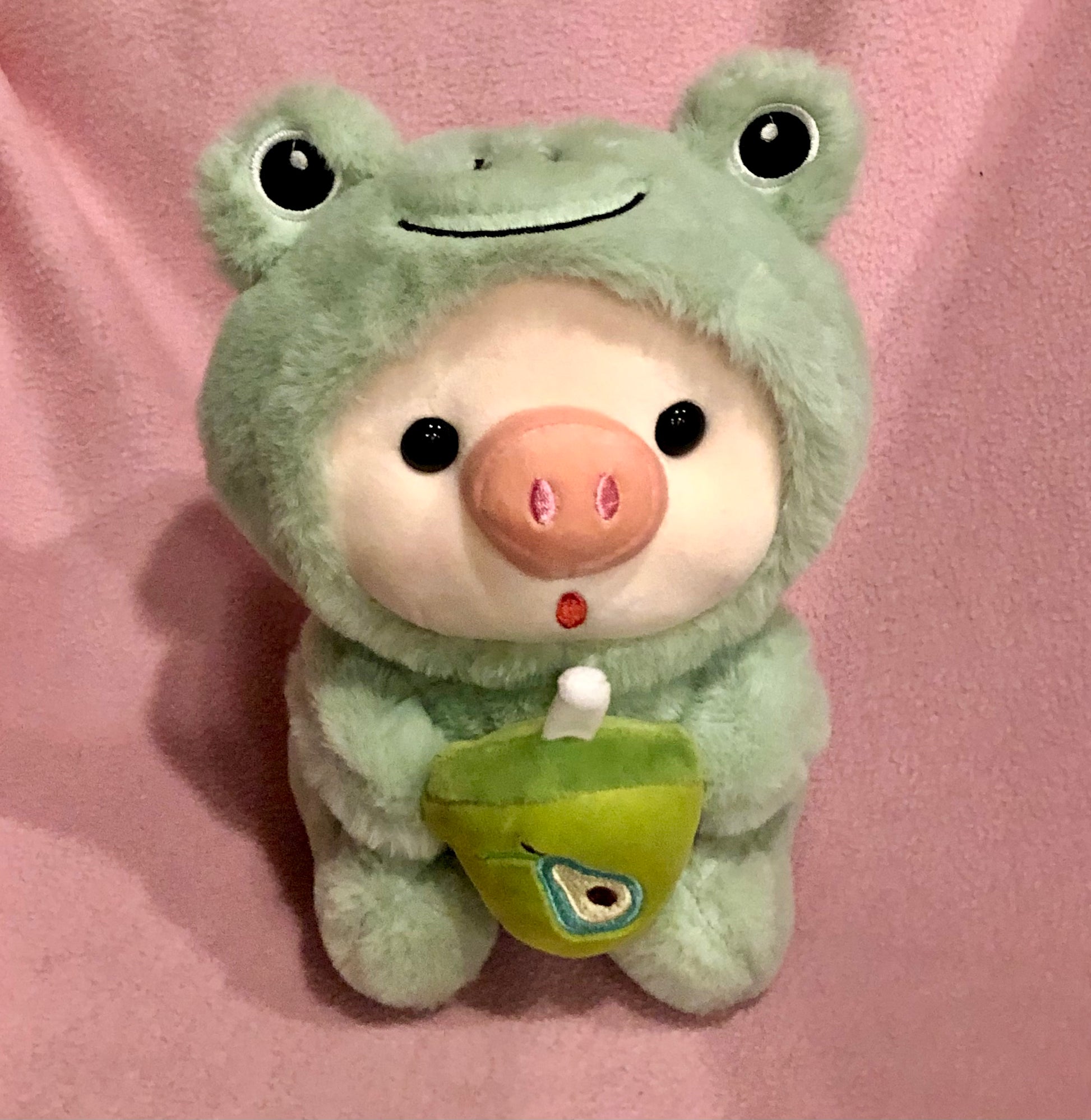 This cute and cuddly plush pig is ready to hop into your heart and home! Dressed in a whimsical frog costume, complete with a green hat and big frog eyes, this little piggy is enjoying a delicious boba drink. The plush toy is made from high-quality materials and features soft, furry fabric that's perfect for snuggling up with. Whether you're a fan of pigs, frogs, or just cute and quirky toys, this plush pig in a frog costume is sure to bring a smile to your face.