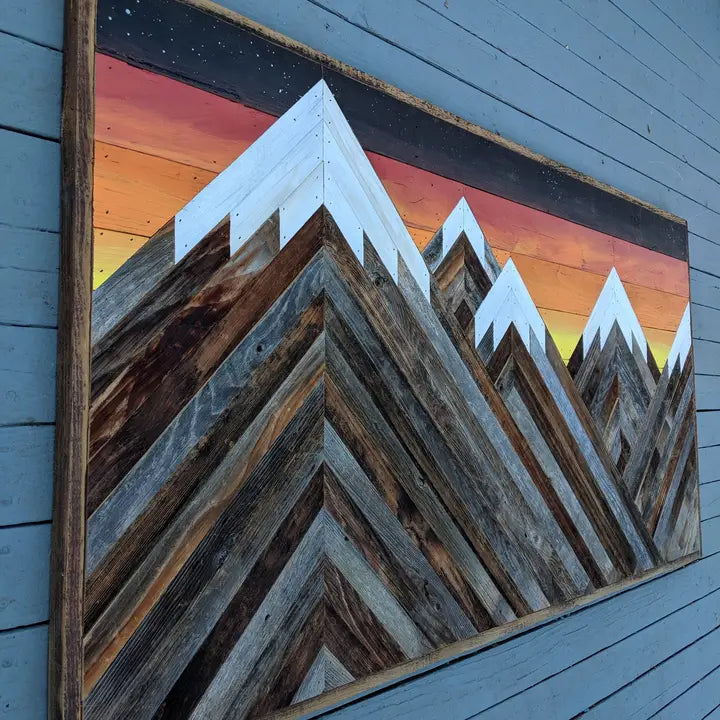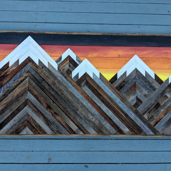 Hand-crafted sunset, snowcapped mountains made from locally re-claimed wood with asymmetrical peaks. This is a single piece 12x24 with several mountain peaks and a sunset sky, adding a rustic touch to any room.