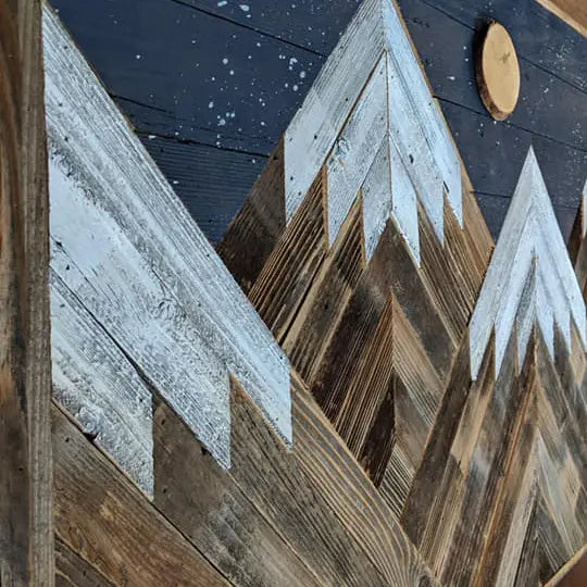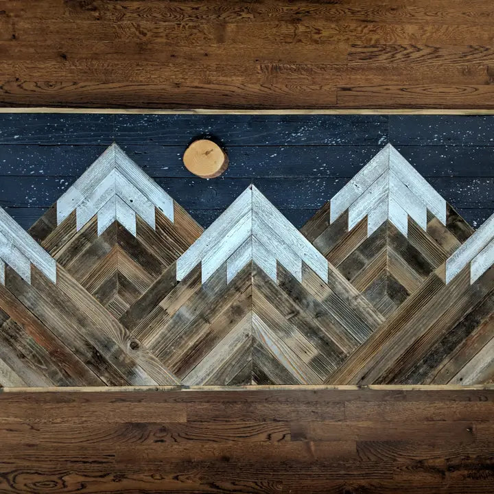 Hand-crafted snowcapped mountains made from locally re-claimed wood. This is a single piece with several mountain peaks a night sky and a moon and stars, adding a rustic touch to any room. Hanging hardware is included.