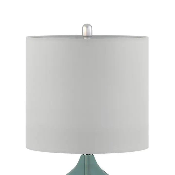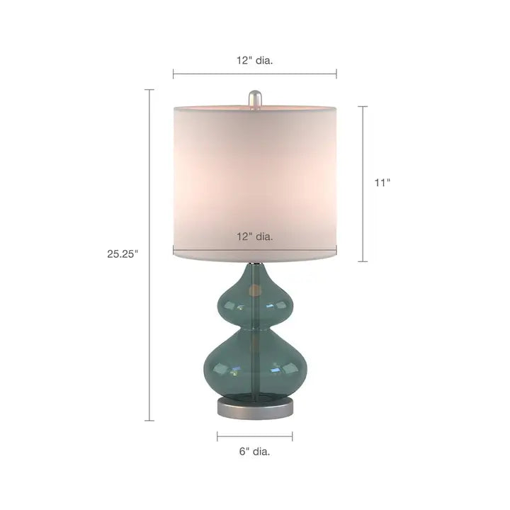 The elegant curves of the glass base are complemented by a white drum-shaped shade for a chic look. Accent your living room or add more light to your bedroom with the transitional appeal of this table lamp. 1 Type A 60W or 13W CFL Bulb is needed (not included)