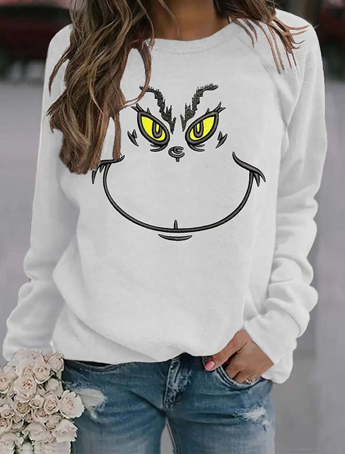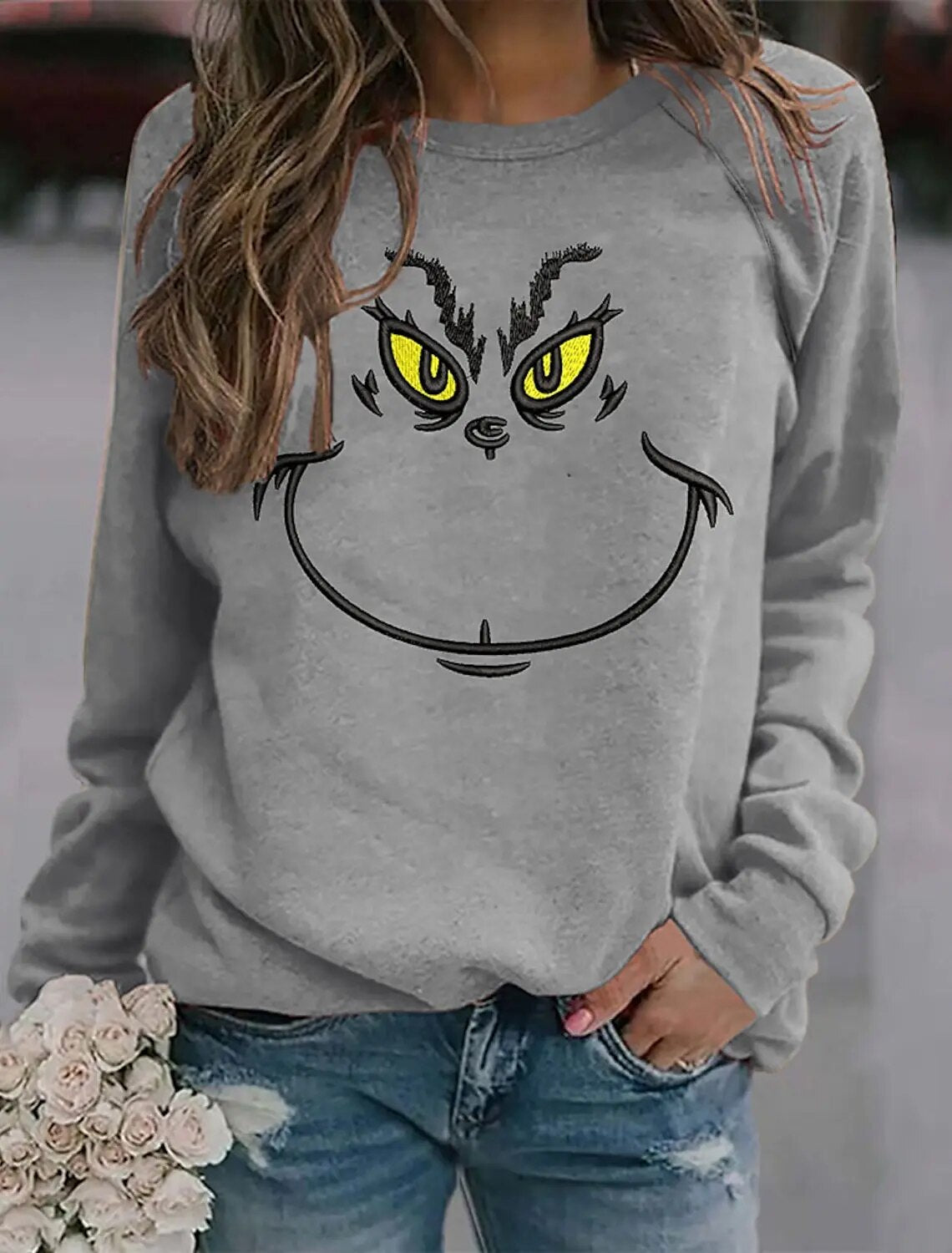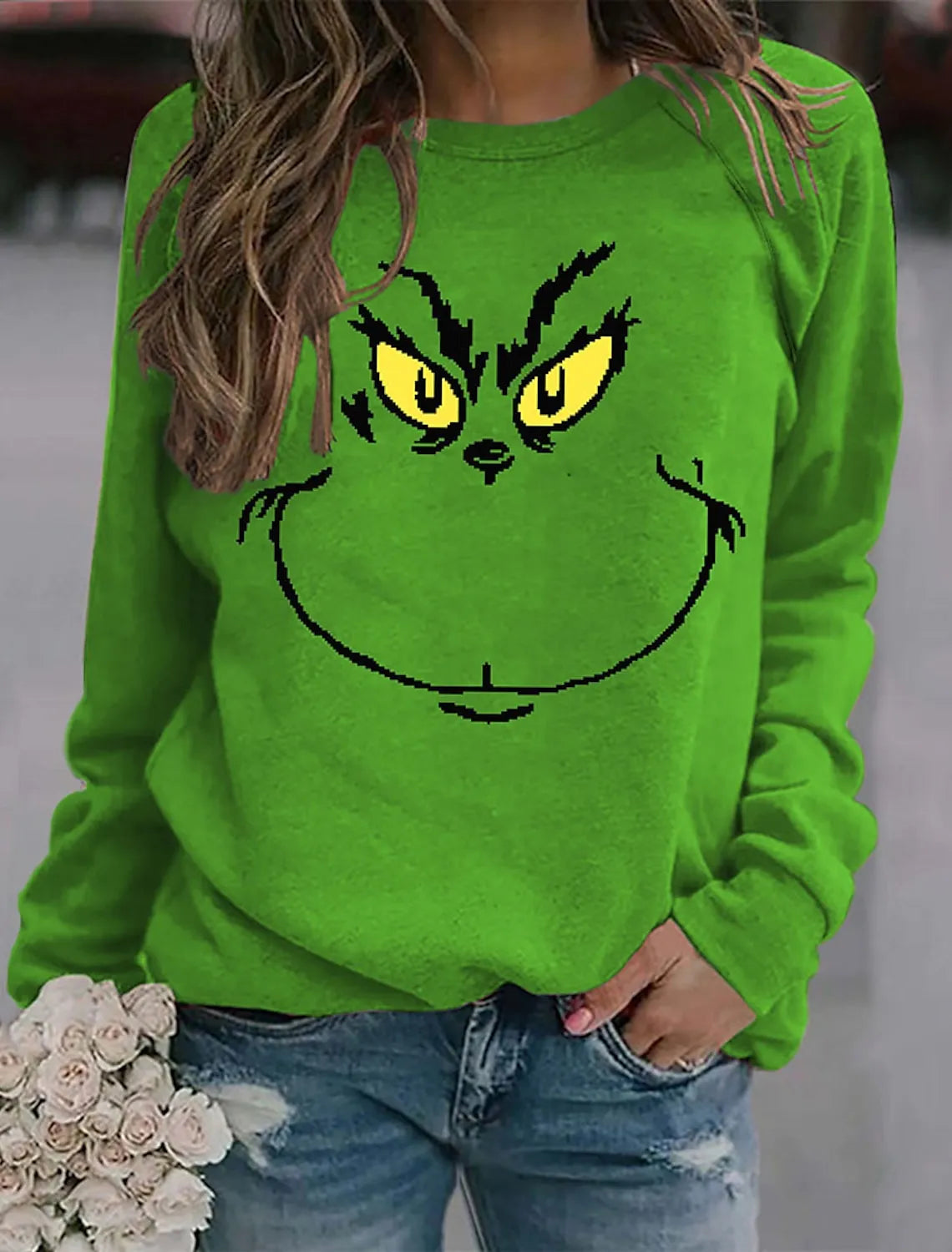 Transform into the mischievous and lovable Grinch with this graphic pullover sweatshirt. Made for women, this cozy shirt will keep you warm while showcasing your playful spirit. Perfect for movie nights, holiday parties, or any occasion where you want to spread some holiday cheer!